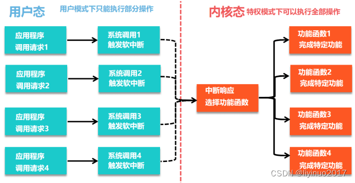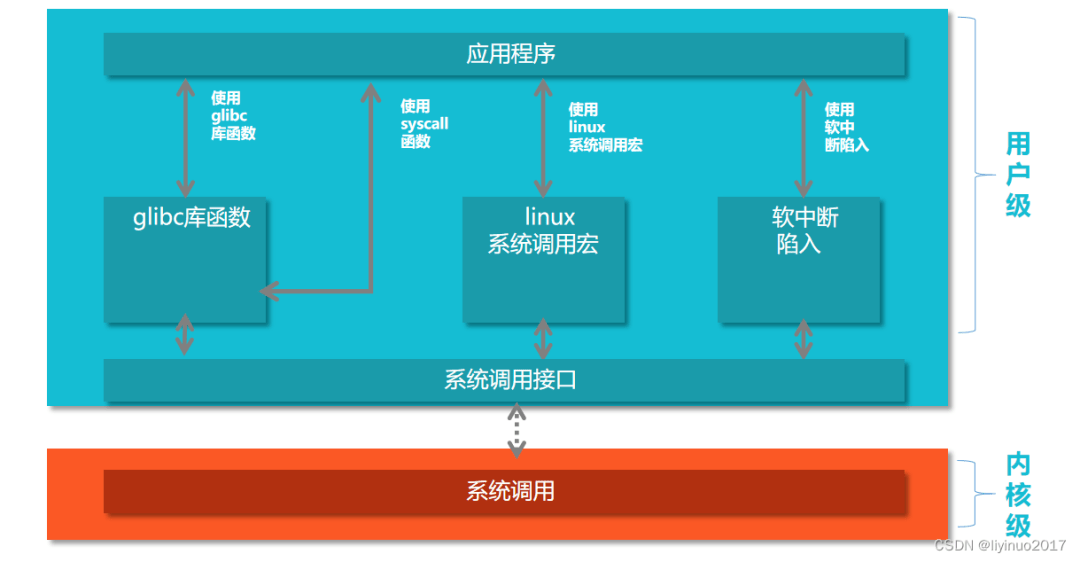linux系统调用的第一部分是调用请求,调用请求作为系统调用提供给应用程序的接口,在linux系统调用的3部分中,应用程序只有使用调用请求的权限(其它两部分应用程序无法接触到), 调用请求需要完成以下两个基本功能: