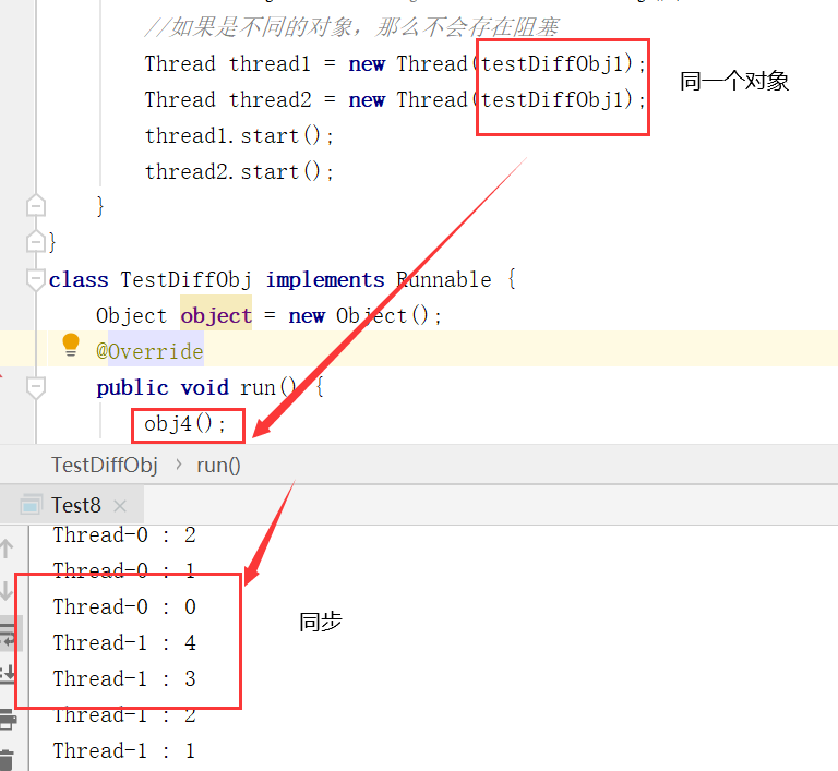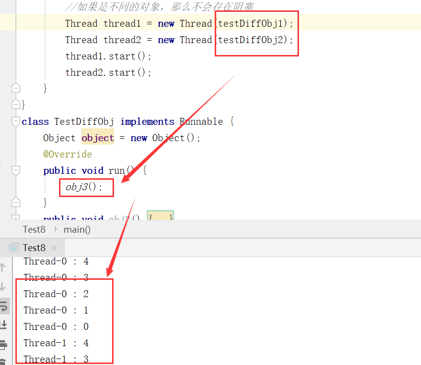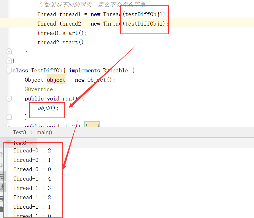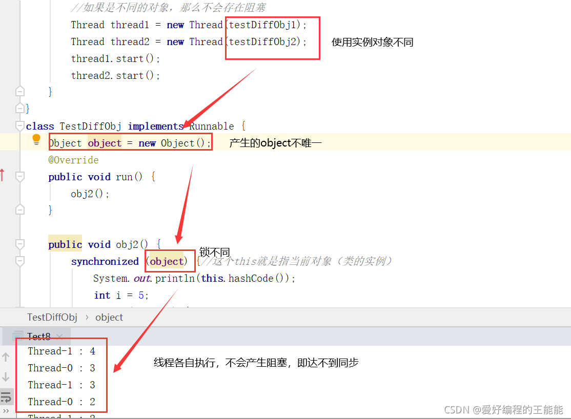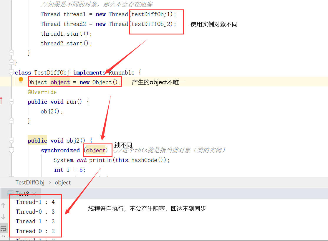 TestDiffObj testDiffObj2 = new TestDiffObj();如果,我们新建的线程用不同的对象实例,那么start后,就会有两个线程同时执行上述代码中的obj2()方法。虽然加锁了,但是锁对象不同,不能达到同步的目的,此时不会存在阻塞。