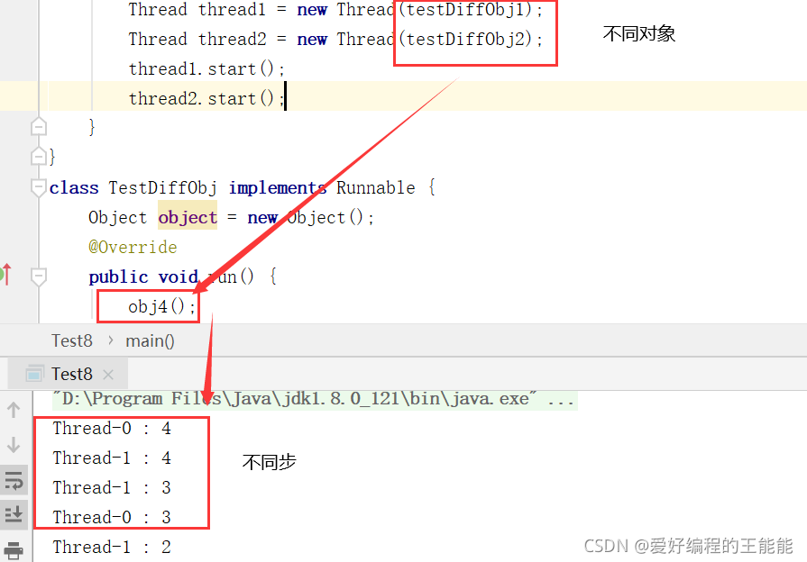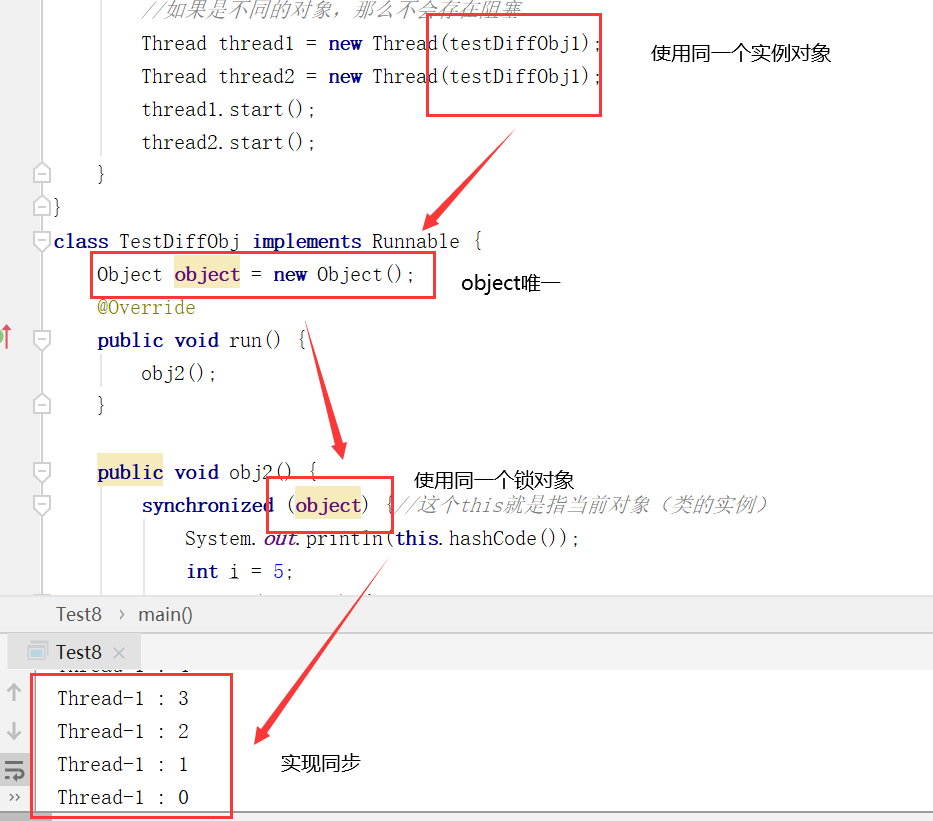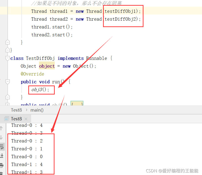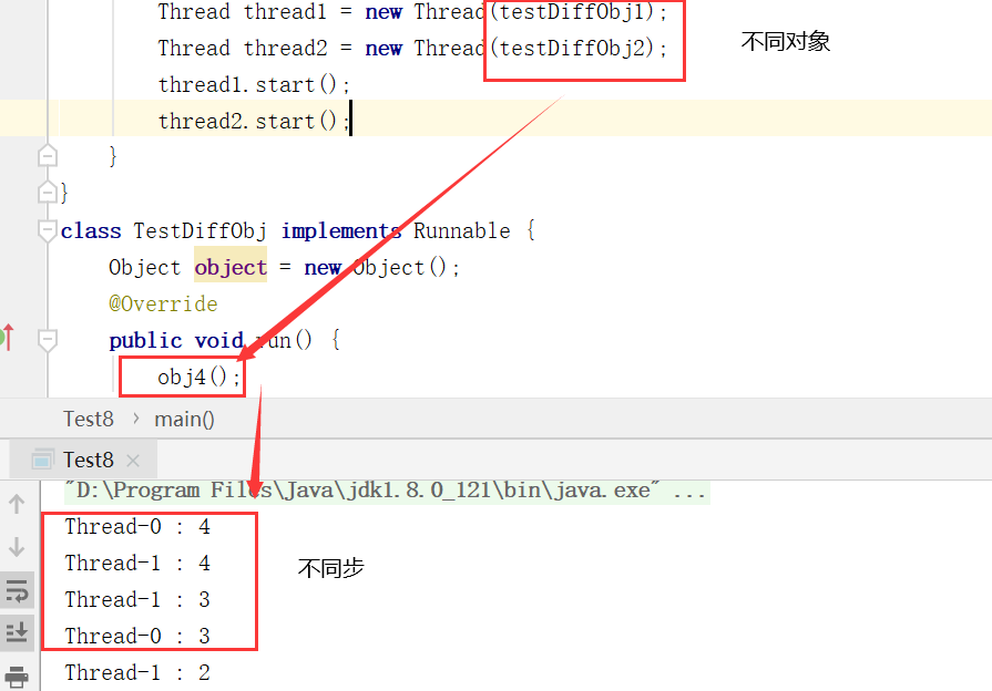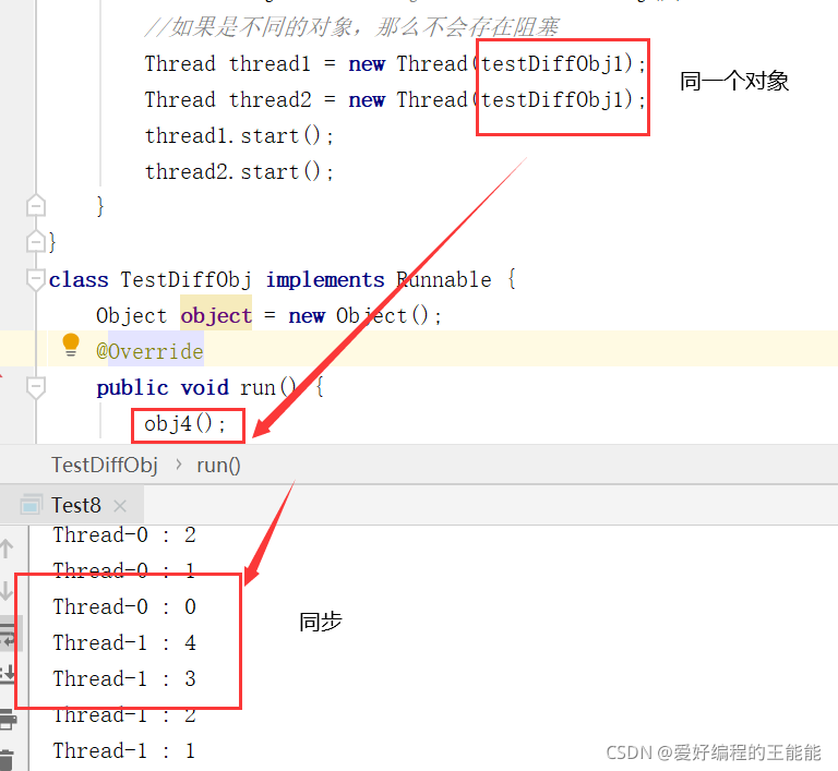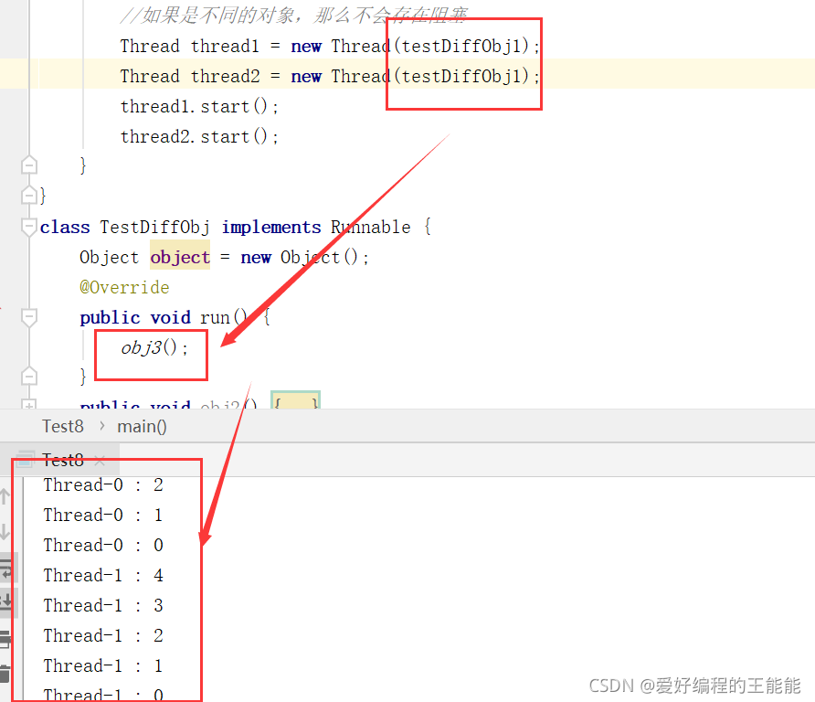 TestDiffObj testDiffObj2 = new TestDiffObj();如果,我们新建的线程用不同的对象实例,那么start后,就会有两个线程同时执行上述代码中的obj2()方法。虽然加锁了,但是锁对象不同,不能达到同步的目的,此时不会存在阻塞。