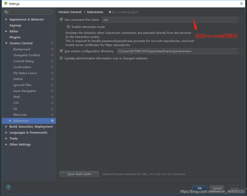 配置svn路径:在上图中的Use Command Line Client中添加svn.exe, svn默认路径C:\Program Files\TortoiseSVN\bin\svn.exe。 若是不存在svn.exe,则安装TotoseSVN未安装command line功能,需重新安装。