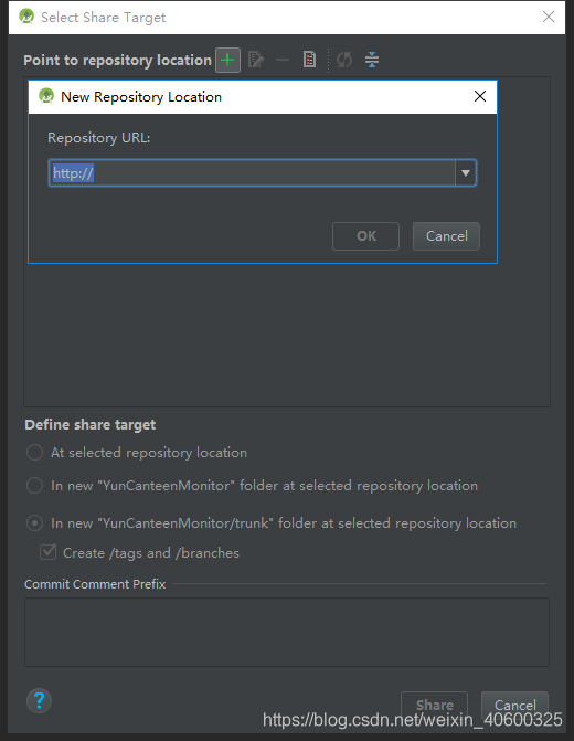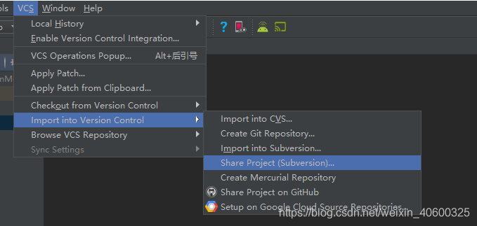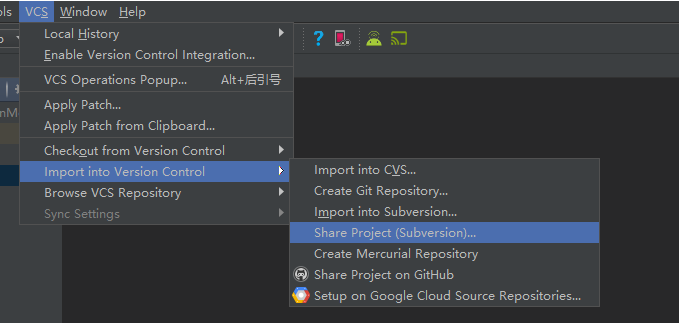打开VCS ——>import into Version Control ——> Share Project Subversion: