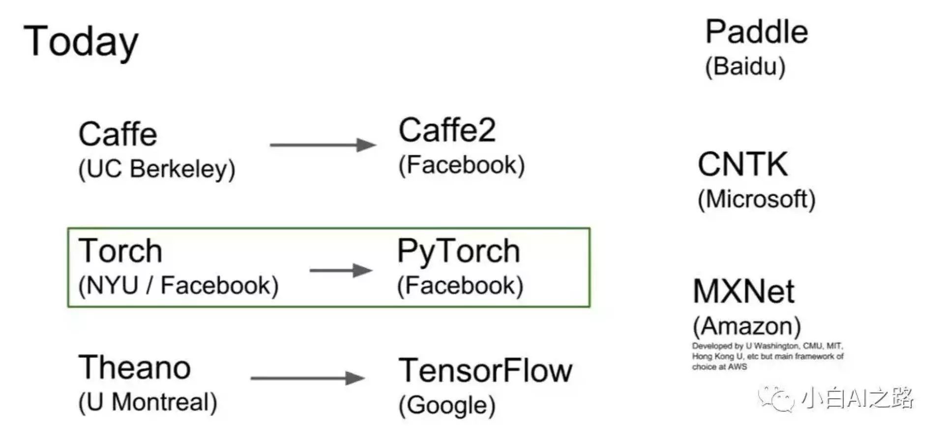 我们再次回到正题哈童鞋们(严肃脸),现在来说说机器学习框架的事情,同样的,这里我们专指深度学习框架。讲真,我写得有点累了,就放张cs231课程里的图吧,大家自己看看这些框架与大学和企业的关系。