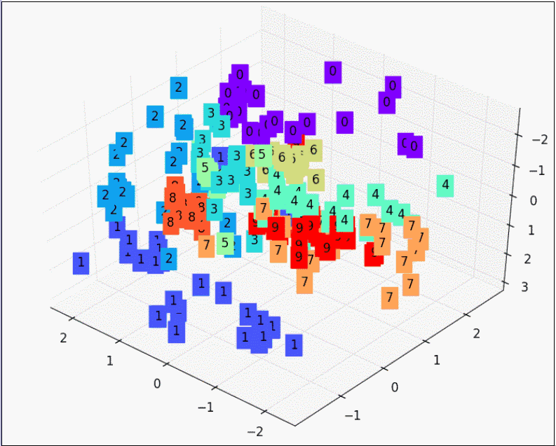 通过观察数据分布是可以发现一些规律的,比如下图的是机器学习中著名的手写识别体数据集mnist(手写的0到9十个数字的图片)的数据经过处理后的可视化效果。