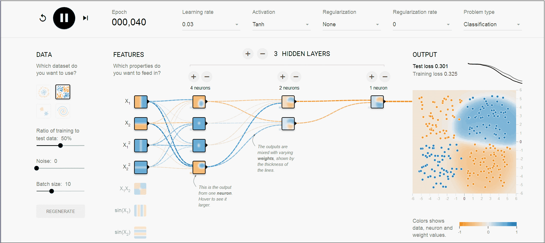 playground提供了几种简单类型的data,你可以去调节网络结构、学习率、激活函数、正则项等参数,你可以非常直观地看到每个神经元和相关输出的变化,体会到简化的深度学习模型调参的过程。