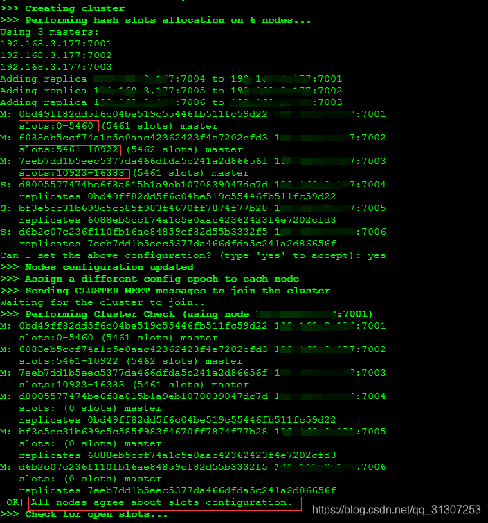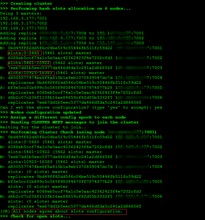./redis-trib.rb create --replicas 1 ip地址:7001 192.168.1.1:7002 192.168.1.2:7003 192.168.1.3:7004 192.168.1.4:7005 192.168.1.5:7006第五:查看启动信息