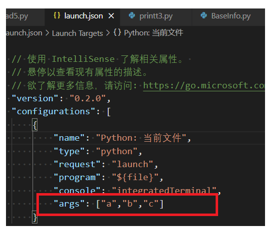 在打开的launch.json文件中添加红色框体内容,则为命令行的参数