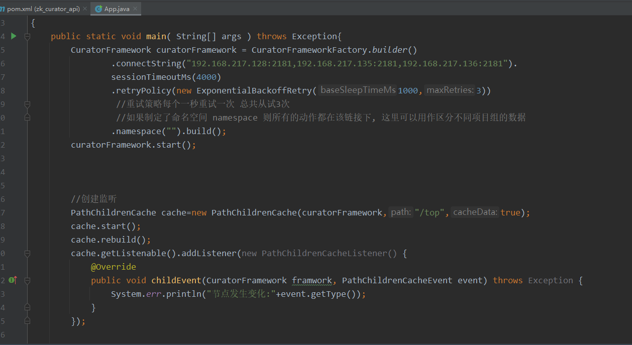 PathChildrenCache cache=new PathChildrenCache(curatorFramework,"/top",true);