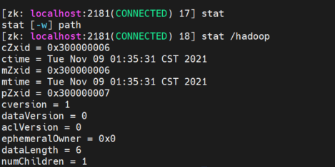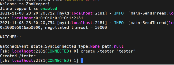 [zk: localhost:2181(CONNECTED) 0] create /node1 1