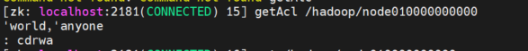 [zk: localhost:2181(CONNECTED) 2] setAcl /node1 world:anyone:cdrwa