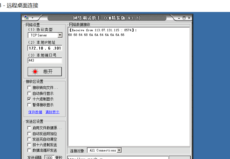 在远程桌面安装网络调试助手,设置为服务器,端口号