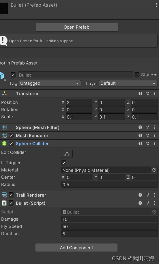 这里我们首先需要预制一个游戏物体,作为我们开枪时发生出去的子弹,单独为其创建一个脚本叫做Bullet,来配置子弹的参数。具体代码如下: