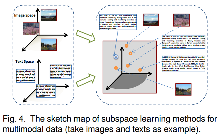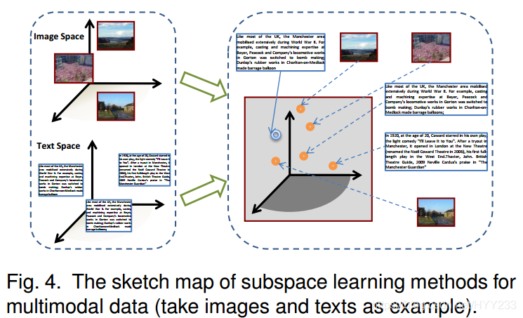 子空间学习方法:目的是学习由不同数据模态共享的公共子空间,其中可以测量不同数据模态之间的相似性。例如Canonical Correlation Analysis[h1] (CCA,最大化两个模态的相关性学习公共子空间,不同模态特征的相似性去学习语义空间), Partial Least Squares[h2] (PLS,转变图像特征到文本空间,通过特征相似性学习语义空间),Bilinear Model[h3] (BLM), cross-modal factor analysis[h4] [h5] (CFA,在转换后的领域,采用最小化F-norm的标准), maximum covariance unfolding[h6] (MCU,最大协方差展开,用于同时降维不同模式数据的流形学习算法) , collective component