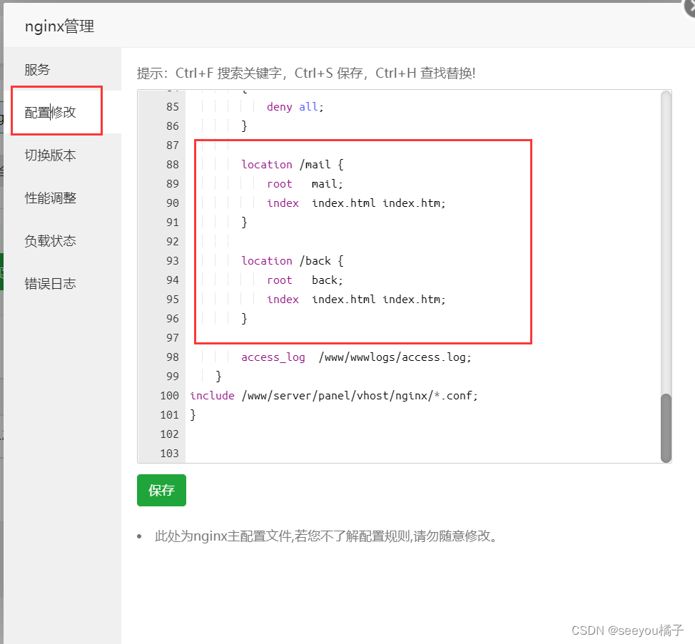 (2)点击配置修改,添加如下内容,如果有两个项目就添加两个location