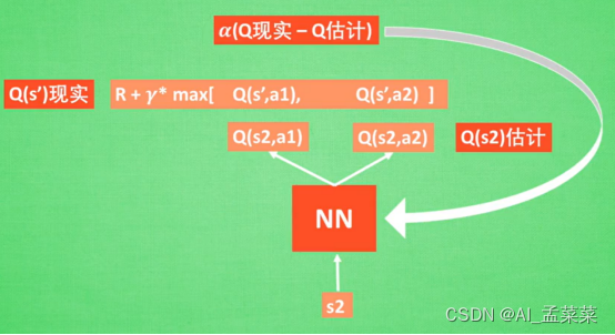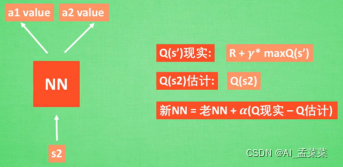 当前的状态呢是写作业(s1),我想判断一下,下一步是写作业(a2)还是看电视(a1),好这个时候我们联想了一下,发现下一个动作选择a2,要比选择a1的到的潜在奖励要高,那么这个时候就会选择a2,那么具体是怎么判断的潜在奖励,可以是使用S1关于a的一个Q表来表示。现在我们将状态更新到了s2,那么接下来是a1还是a2,这个时候又更新了一个Q表,来做选择,依次重复。