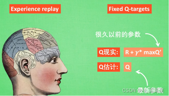 Experience replay:很简单,就是再过往得经历当中,随机的去抽样,去学习参数,就好像一个数据库一样,随机抽样,消除了经历之间得相关性,这样可以更高效得学习到神经网络中得参数。而Fixed Q-target:使用两个结构相同得网络,一个网络中使用最新得参数预测Q得预测值,另一个网络中使用老的参数得到Q得真实值。然后对比去更新。