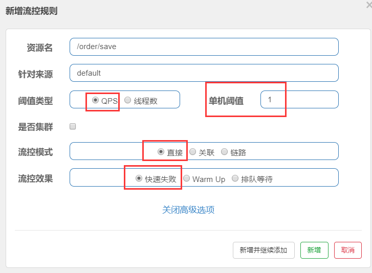 因为是测试,这个做个最简单的限流,1秒钟只允许下1次订单(/order/save),如超过次数1,就直接快速失败,报默认错误。