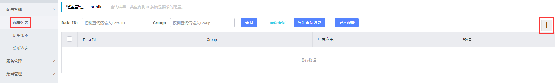 2.访问http://192.168.1.14:8848进入Nacos控制台管理,配置管理-配置列表,点击+号。