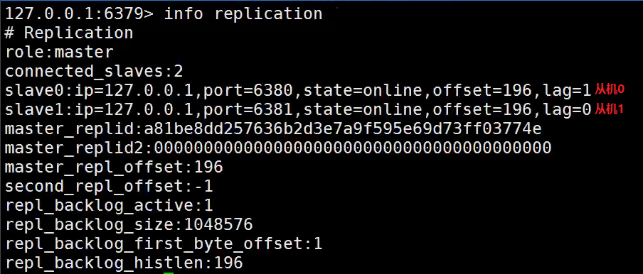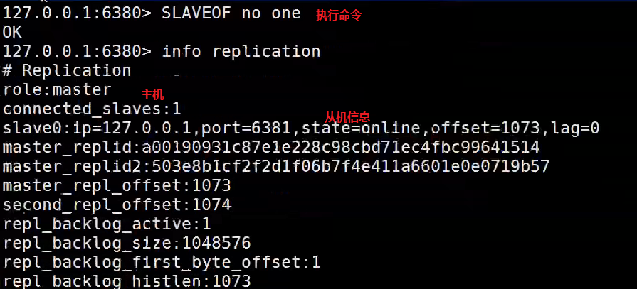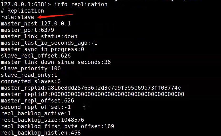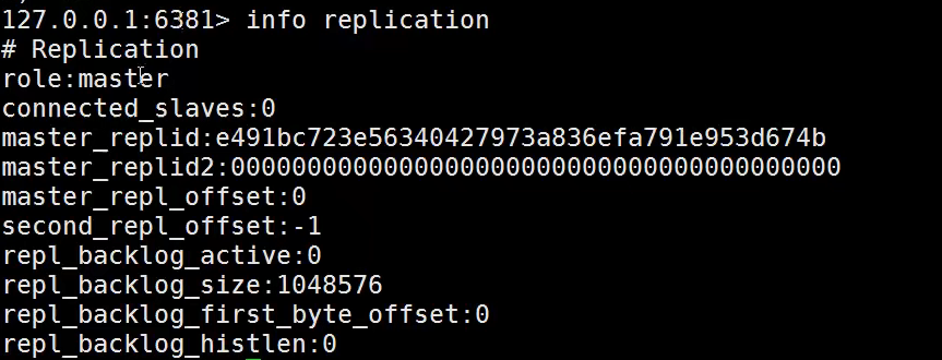 从机(6381)查看 info replication 发现重启后变为主机,因为刚才用了命令配置主从,没有在conf配置文件中设置