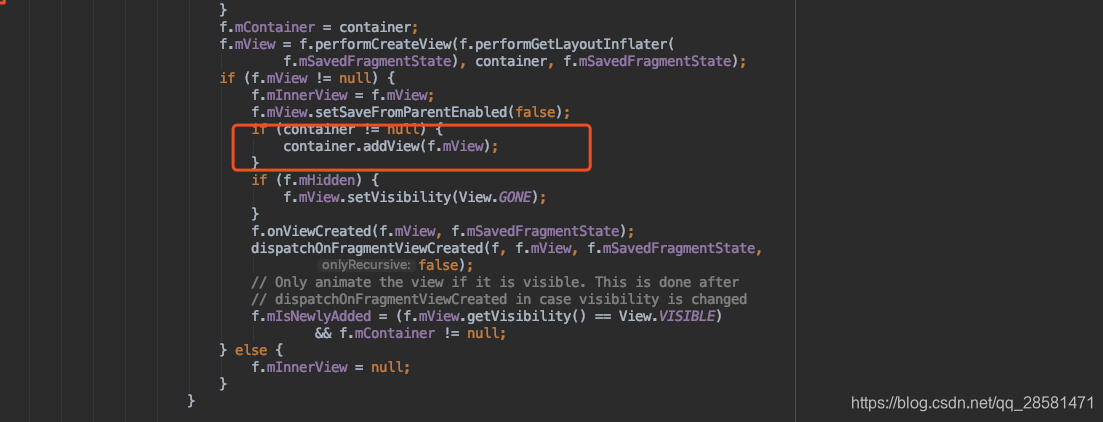 看报错信息的意思是f.mView有属于它的父view,刚看到这可懵了,这是FragmentManager的源码,我可怎么改,最后继续分析下去,来看看f.mView是怎么来的,它是performCreateView方法的返回值,于是就走进去看看