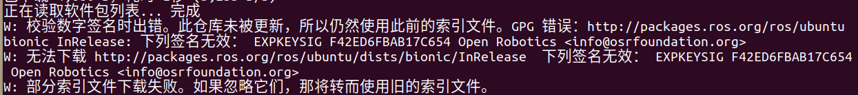 问题描述:Ubuntu下载功能包时出现:检验数字签名时出错,此仓库未被更新,所以仍然使用此前的索引文件