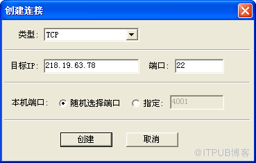 3、点“创建连接“,输入另一电脑的IP址218.19.63.78和端口22,然后点创建。