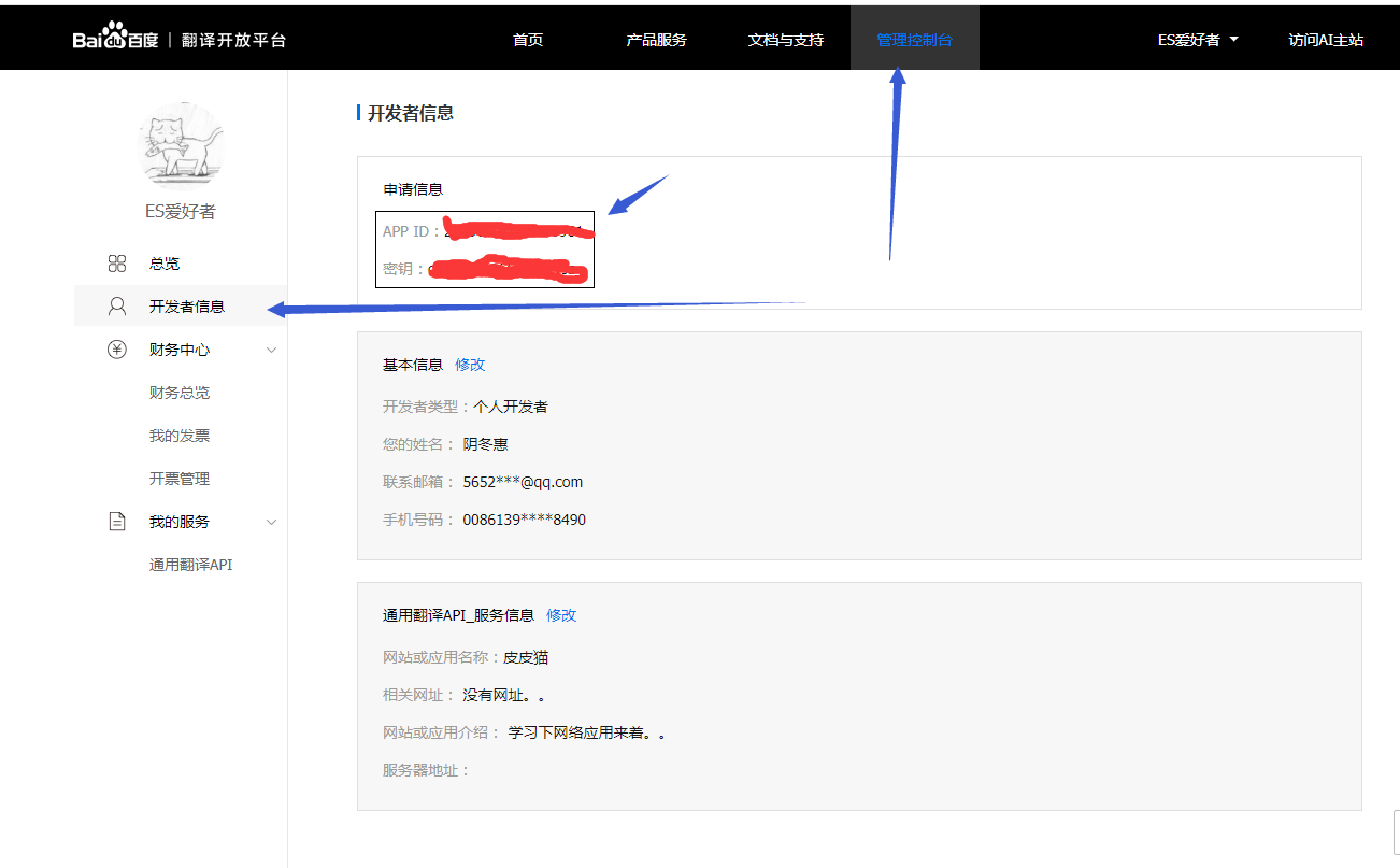 # 对应的填入你注册后给你的ID和密匙,点上面的管理控制台,然后点左边的开发