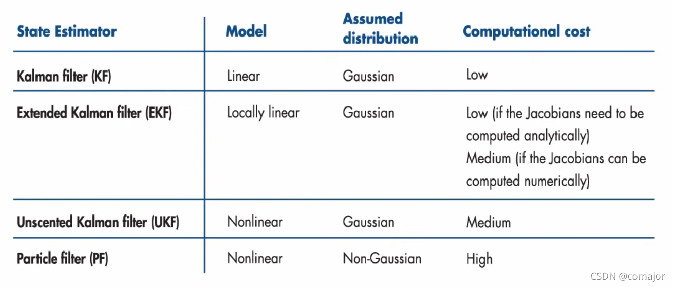 至此,四种滤波器的主要分别集中在主要在适用模型、状态分布假设和计算量上,列表如下