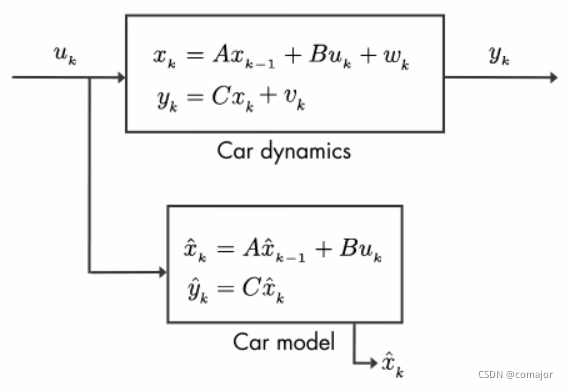 其中输入u k u_kuk和输出y k y_kyk分别代表速度和位置,w k w_kwk表示过程噪声(process noise),v k v_kvk表示测量噪声(measurement noise),它们假设都是服从高斯分布的噪声