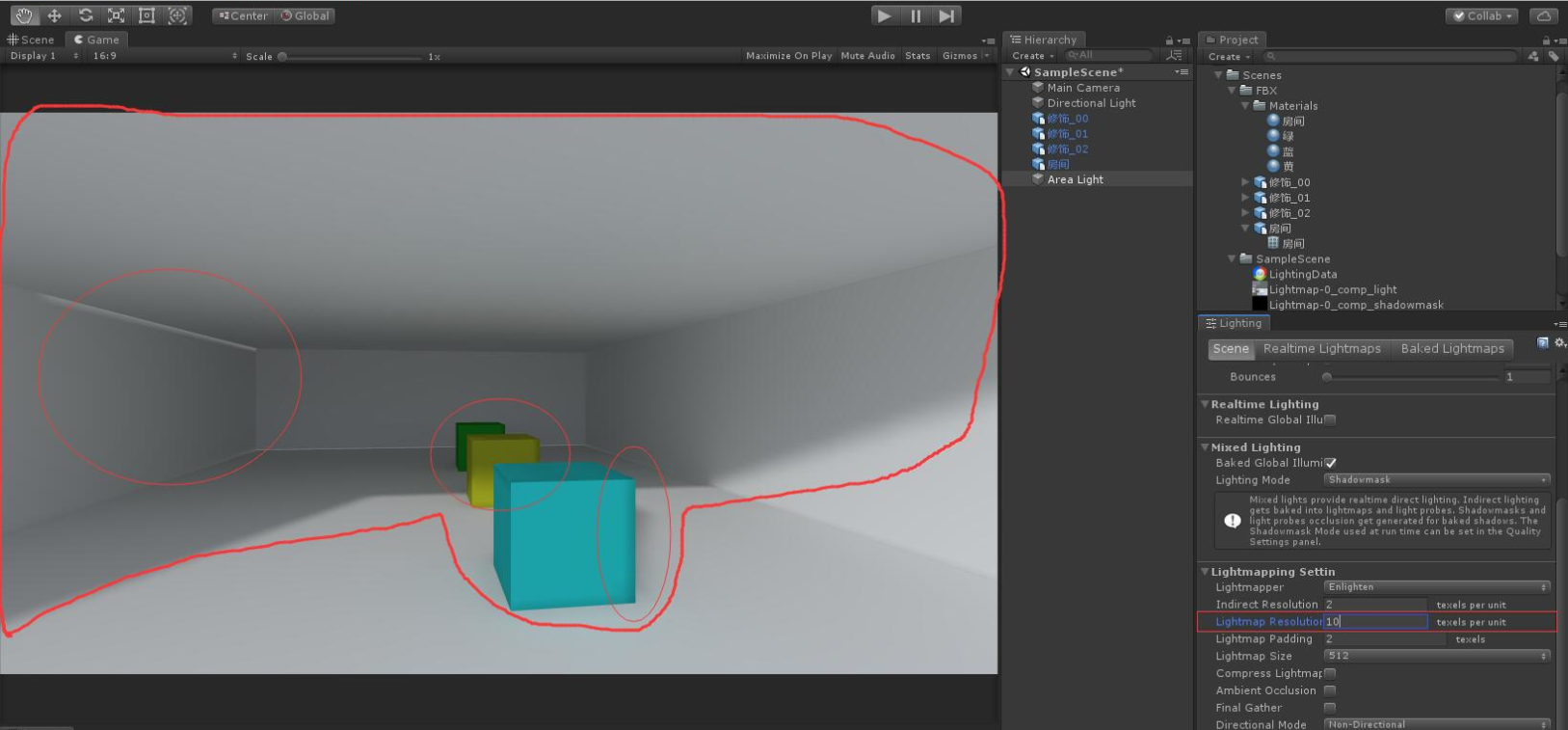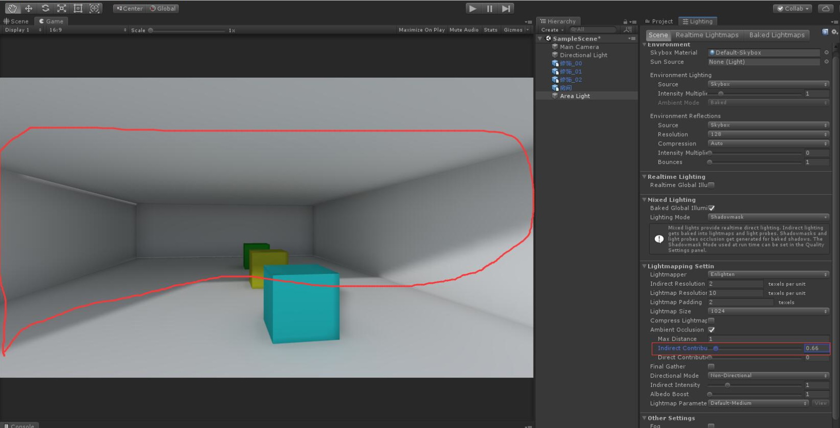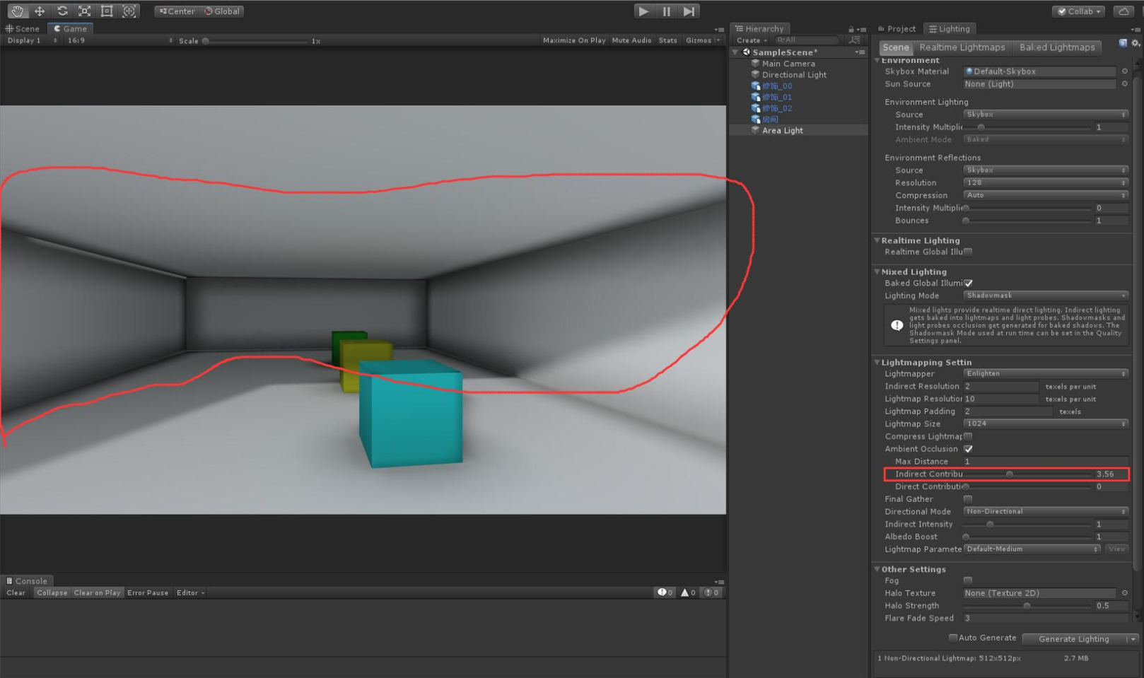 Indirect Resolution(间接分辨率)的值最好不要太大,我一般就0.2-0.6,值越大,烘焙时间越长,默认是2,如果确实需要大参数,而且场景大的话,晚上下班再烘吧