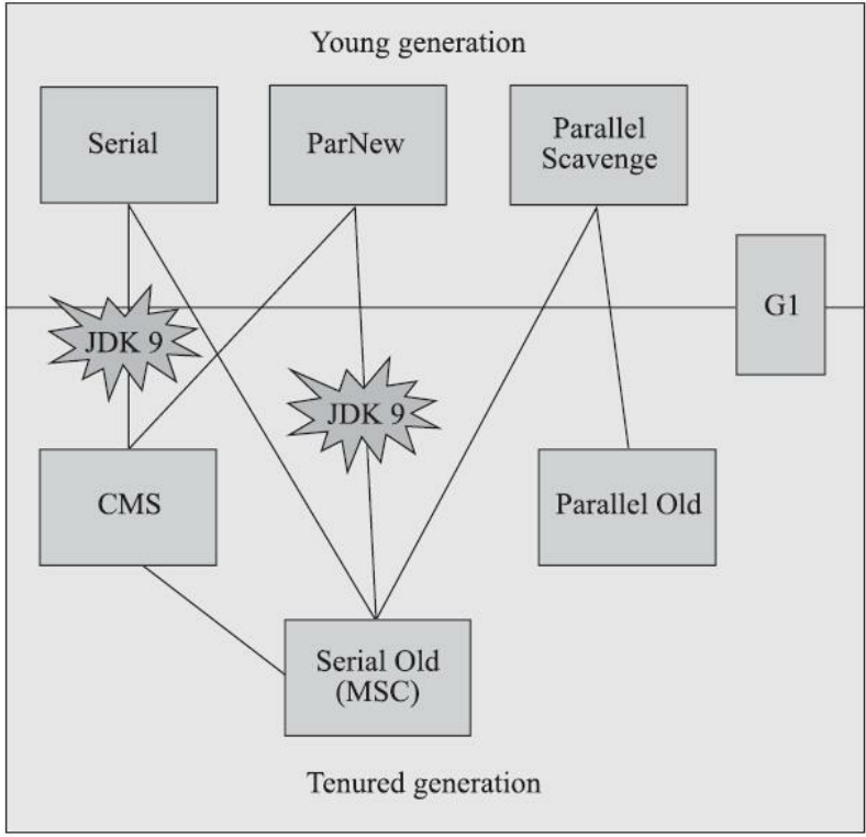 图展示了七种作用于不同分代的收集器,如果两个收集器之间存在连线,就说明它们可以搭配使用[3],图中收集器所处的区域,则表示它是属于新生代收集器抑或是老年代收集器。