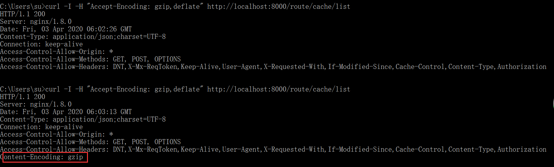 测试对于json的压缩 前后两次通过nginx访问http://localhost:8000/route,后台进行反向代理到具体rest服务。