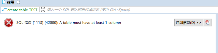 正确的:看上述的提示信息,提示创建表的时候至少加一列(一个字段)