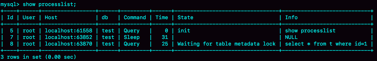 state显示在等表metadata锁(5.6及之前)表示表上正在执行表修改命令,持有了表的metadata写锁。阻塞查询语句的执行。