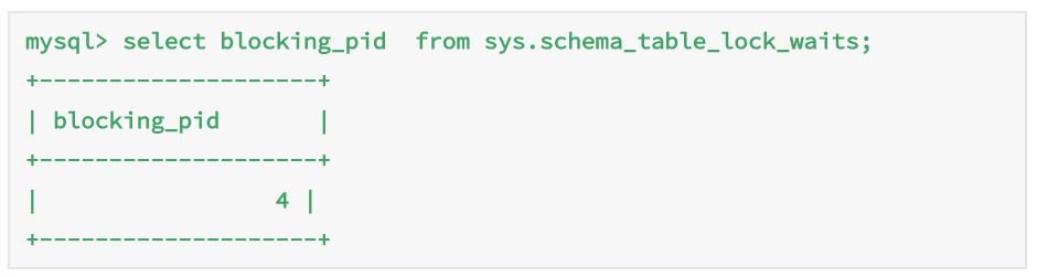 通过查询sys.schema_table_lock_waits表 我们就可以直接找出造成阻塞的 process id,把这个连接用 kill 命令断开即可。