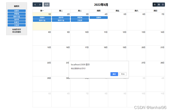 这一步实现点击日历中的值班员名称,弹出删除确认,确认删除后,异步在数据库中删除对应的值班员记录,删除后返回界面,在点击的当日日期上清楚该值班员。因为使用了异步,因此界面不会有刷新的不适。