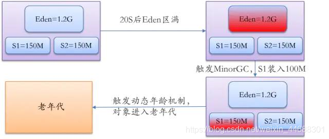 基本上,可以看到20S后Eden区就满了,此时再运行的时候对象已经无法分配,会触发MinorGC,假设在这次GC后S1装入100M,马上过20S又会触发一次MinorGC,多出来的100M存活对象+S1区的100M已经无法顺利放入到S2区,此时就会触发JVM的动态年龄机制,将一批100M左右的对象推到老年代保存,持续运行一段时间,系统可能一个小时候内就会触发一次FullGC。