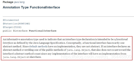 An informative annotation type(信息注释类型) used to indicate(表明) that 【an interface type declaration is intended(意图) to be a functional interface as defined by the Java Language Specification(规范)】. Conceptually(从概念上讲), a functional interface has exactly(仅仅) one abstract method. Since(因为) default methods have an implementation, they are not abstract. If an interface declares an abstract method 【overriding one of the public methods of java.lang.Object】, that also does not count toward the interface's abstract method count(其不计入接口抽象方法计数) since any implementation of the interface will have an implementation from java.lang.Object or elsewhere(因为任何一个该接口的实现都将有一个来自于 java.lang.Object或其它地方的实现).