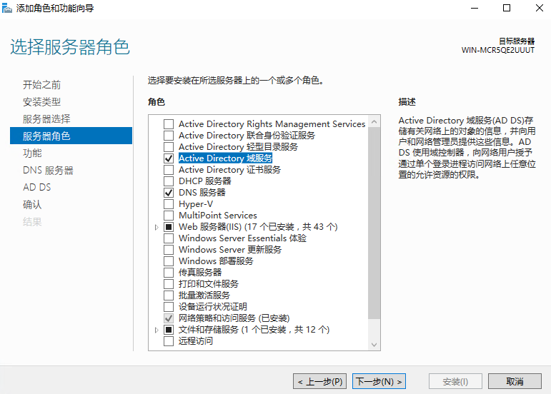 2、下一步-勾选AD域和DNS服务器(请勿勾选远程桌面服务)