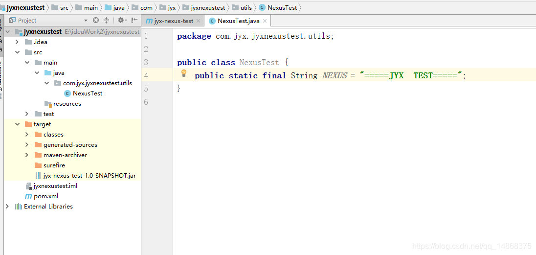 </project>3、先将这个项目打包出来一个jar包,然后打开idea的Terminal执行 mvn deploy 命令即可将jar包发布到Nexus。如下图所示