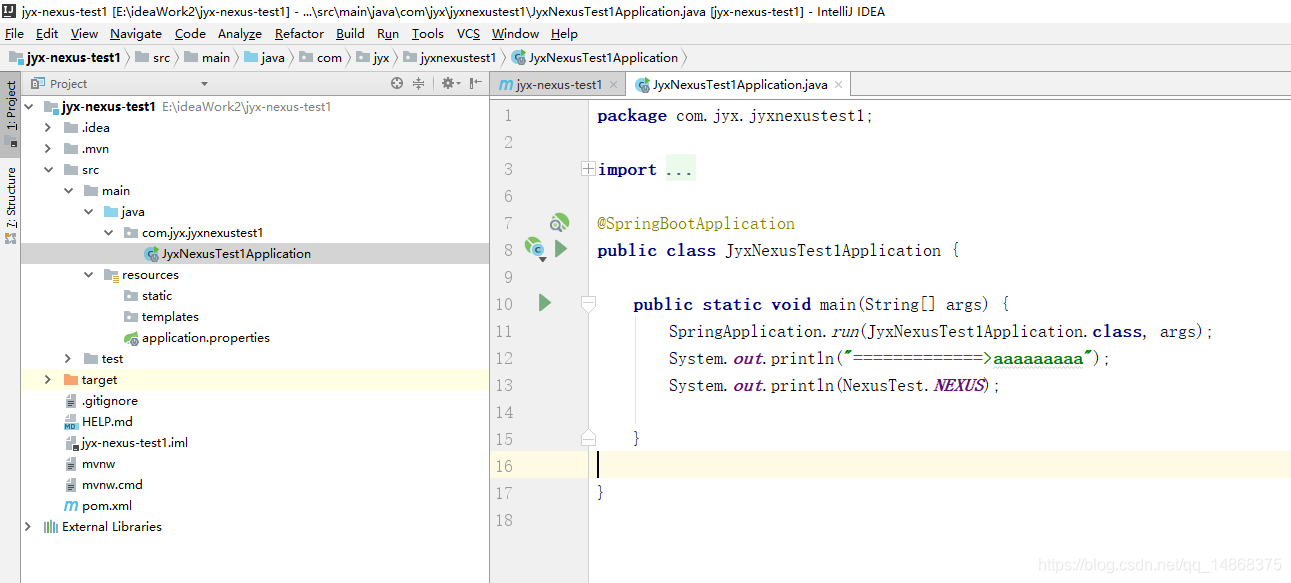 5、新建一个普通的spring boot项目并在pom文件中引入这个jar包的依赖,然后再启动类中写上打印引入jar包的代码,启动项目测试能否引入成功。