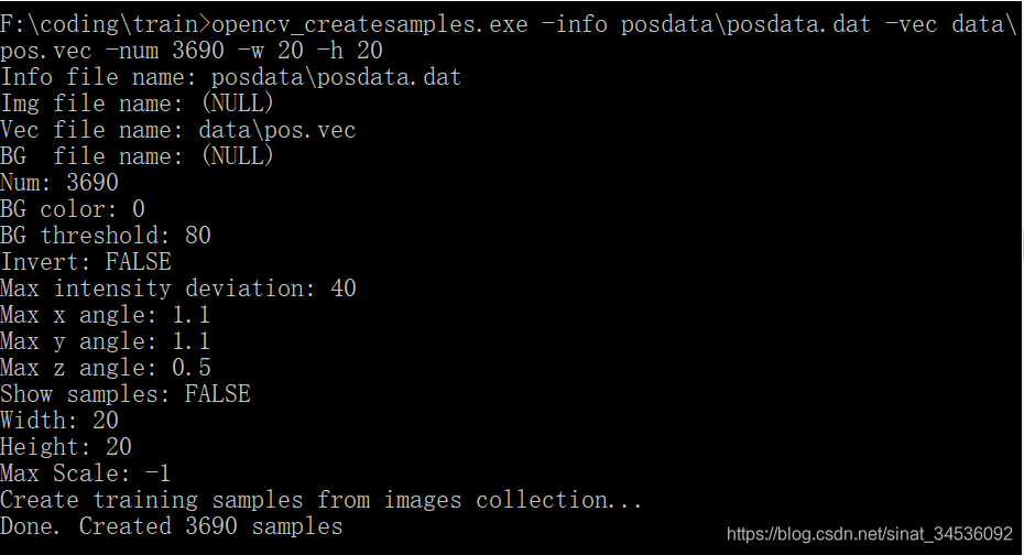 输入:opencv_createsamples.exe -info posdata\posdata.dat -vec data\pos.vec -num 3690 -w 20 -h 20
