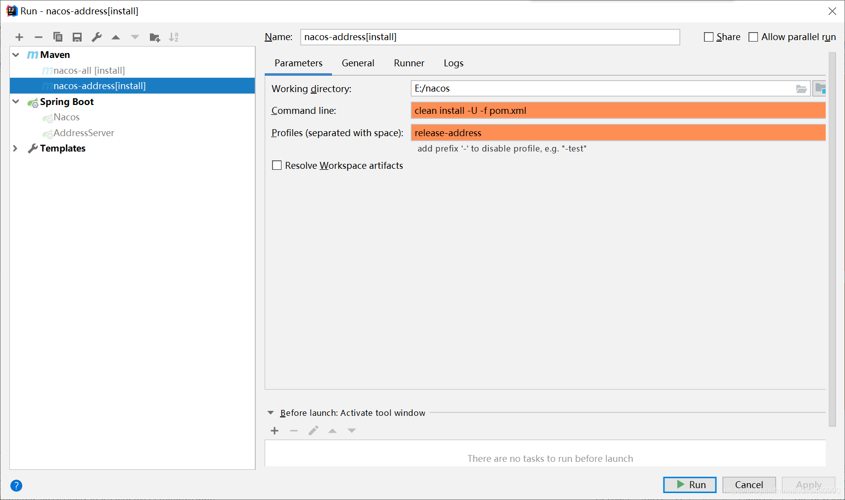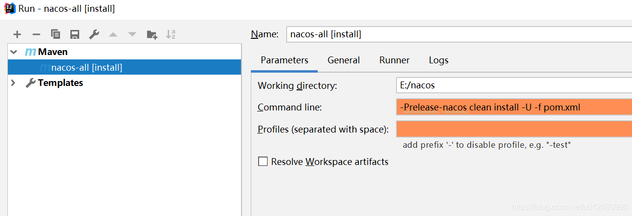 打开 Run->Run..->Maven->nacos-all[install],在Command line输入: