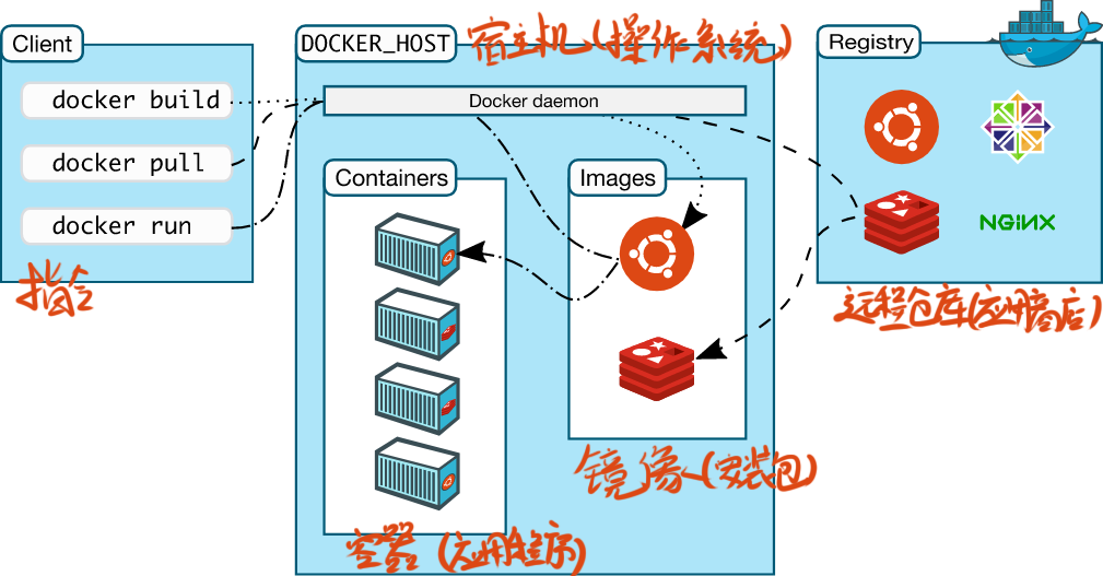 - Docker Client是安装完成Docker之后,直接使用的docker命令。