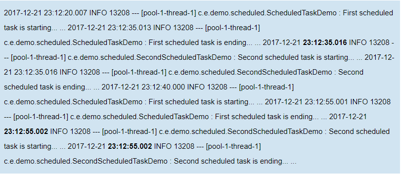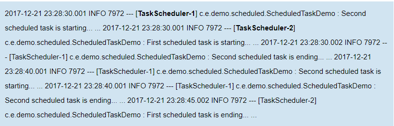 上面的代码提供了一个线程池大小为2的taskScheduler, 现在再启动下SpringBoot看看效果.