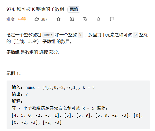 class Solution { public: int subarraysDivByK(vector<int>& nums, int k) { int pre=0;//累计求前缀和变量 unordered_map<int,int> mp;//哈希表,存所有前缀和结果 mp[0]=1;//第一个元素nums[0]:视为pre[1]-pre[0] int res=0; for(int i=0;i<nums.size();i++){ pre+=nums[i]; //同余数:pre[i]mod k==pre[j]mod k int m=((pre%k)+k)%k;//+k是避免负数 if(mp.find(m)!=mp.end()){ res+=mp[m]; } mp[m]++; } return res; } };