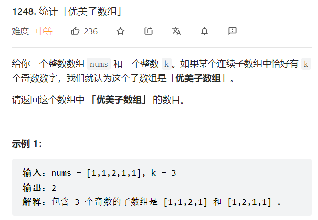 class Solution { public: int numberOfSubarrays(vector<int>& nums, int k) { int odd=0;//计算当前前缀和的奇数个数 unordered_map<int,int> mp;//key:奇数个数,次数 mp[0]=1; int res=0; for(int i=0;i<nums.size();i++){ odd+=(nums[i]%2==1)?1:0; if(mp.find(odd-k)!=mp.end()){ res+=mp[odd-k]; } mp[odd]++; } return res; } };