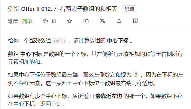 class Solution { public: int pivotIndex(vector<int>& nums) { //遍历一遍元素,求出数组总和 int presum=0; for(int i=0;i<nums.size();i++){ presum+=nums[i]; } //再遍历一遍数组,求满足题意的 int leftsum=0;//下标左元素之和 for(int i=0;i<nums.size();i++){ if(leftsum==presum-nums[i]-leftsum){//右一半=全-左一半-该元素 return i; } leftsum+=nums[i]; } return -1; } };