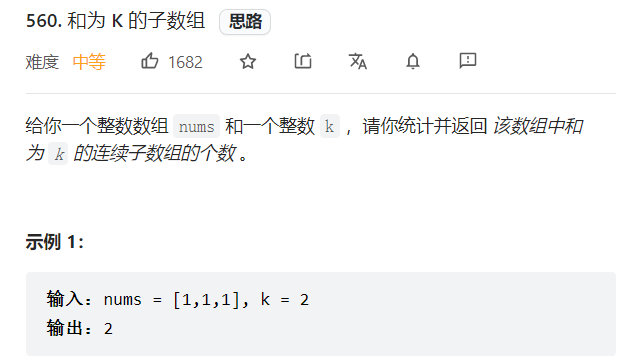 class Solution { public: int subarraySum(vector<int>& nums, int k) { //创建前缀和 int* prefix=new int[nums.size()+1]; int pre=0; //声明哈希表 unordered_map<int,int> mp;//K---prefix[i],V---次数 mp[0]=1;//prefix[0]=0; //判断过程 int res=0; for(int i=0;i<nums.size();i++){ //当前前缀和减去给出k值是否在哈希表中存在 pre+=nums[i]; if(mp.find(pre-k)!=mp.end())//找到了 res+=mp[pre-k];//频次累计 //更新哈希表 mp[pre]++; } return res; } };