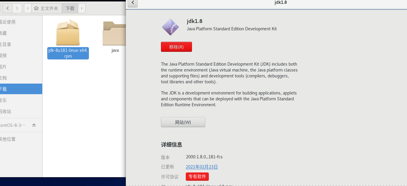 下载下来的jdk-8u181-linux-x64.rpm就像是win系统的exe一样是在图形界面上直接安装的。双击。因为本机已经安装了所以在此就显示的是【移除】,正常的话双击就显示【安装】。等待安装完毕即可。