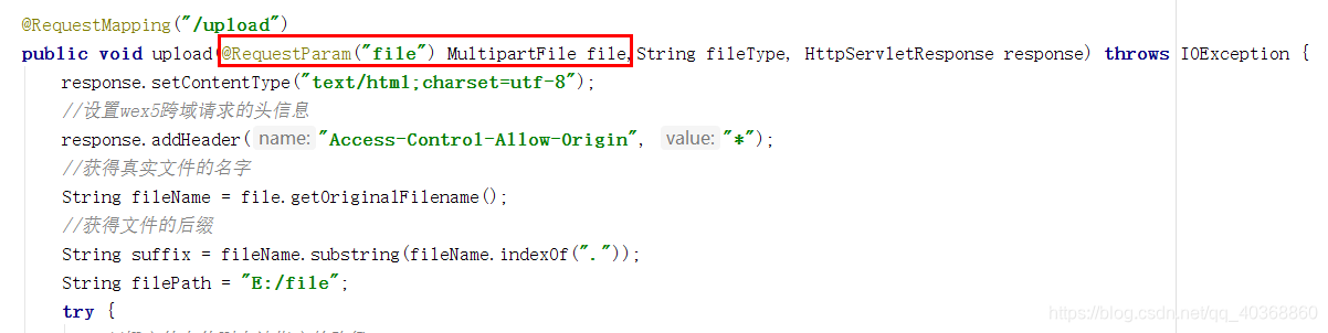 file获取文件输入流对象,因为<input>中声明的是name="file"。